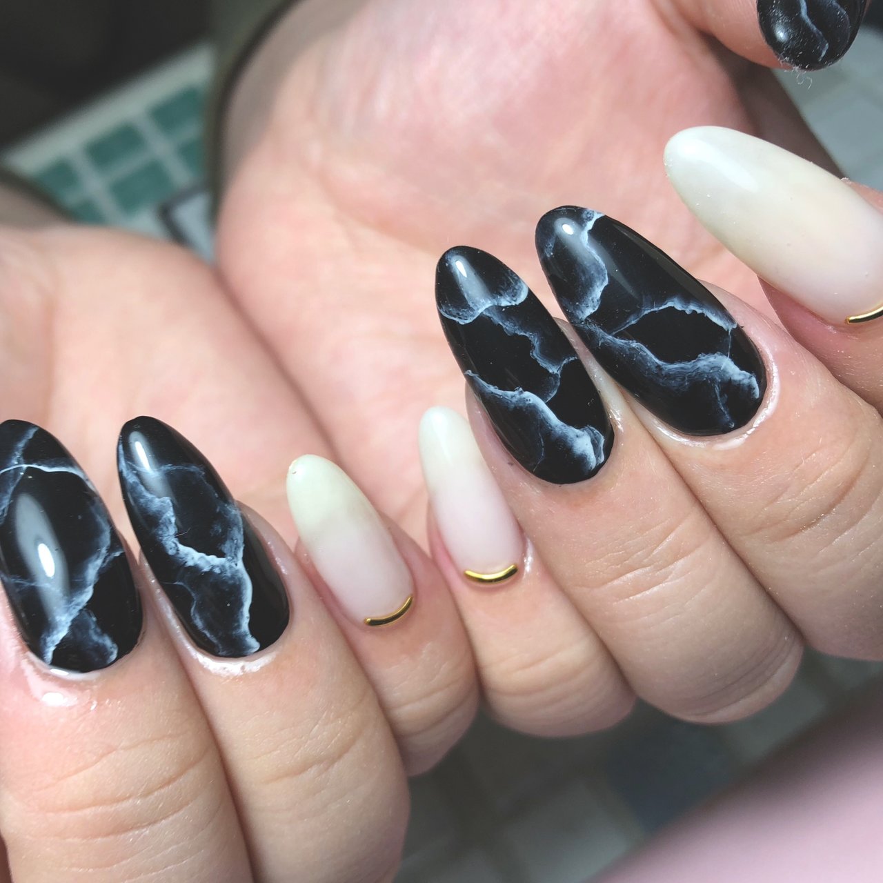 親指、薬指にはベージュカラーの天然石ネイルになっており 人差し指、小指の大きめのパーツがかわいいです♥ 中指は、キラキラのゴールドのワンカラーです! 左右同じ色がいい!違う色がいい!などありましたら お気軽にどうぞ♪ お仕事上ネイルができない方やお休みの日のみ楽しみ今流行りのミントカラーをくすませて大人に、天然石とシェル、メタリックジェルをふんだんに使用し他にはないニュアンスネイルに仕上げました! クリアと組み合わせることで涼し気に春先から夏までたくさんお使いいただけます。 天然石は角度によってオーロラに輝きます♪ 大人カワイイ大理石ネイルとは? この投稿をInstagramで見る あい ***self nail***(@ai_nail_nya)がシェアした投稿 年 7月月21日午後4時01分PDT 大理石ネイルとは、名前の通り大理石をモチーフにしたネイルデザインのことです。 天然石ネイルのひとつとして、幅広い年代から人気があります。 大理石ネイル